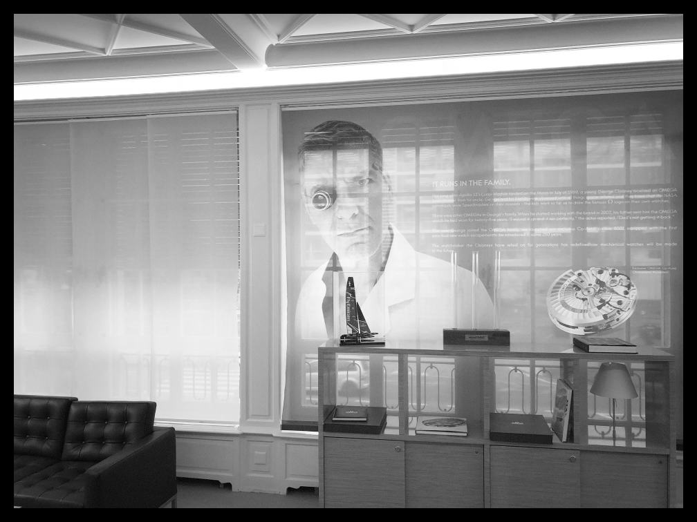 The first floor is roughly divided into three sections. One with the history of the creation of Omega and watches up to about 1960. One room with the “more recent” history of Omega and there especially the sporty innovative history of Omega and Seamaster, Railmaster and Speedmaster history, chronometer competitions, Co-axial escapement and much more. There is a room dedicated to pilot watches and one with the latest models. George Clooney with magnifying glass and smock, he also builds watches on his own.